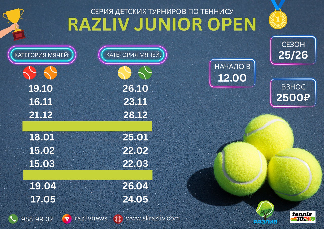 Каждый месяц мы проводим детские турниры по программе 10s в категориях - красный, оранжевый , зеленый , желтый мяч. Наш клуб провел более 100 детских турниров KURORTNIY OPEN KIDS, RAZLIV JUNIOR OPEN